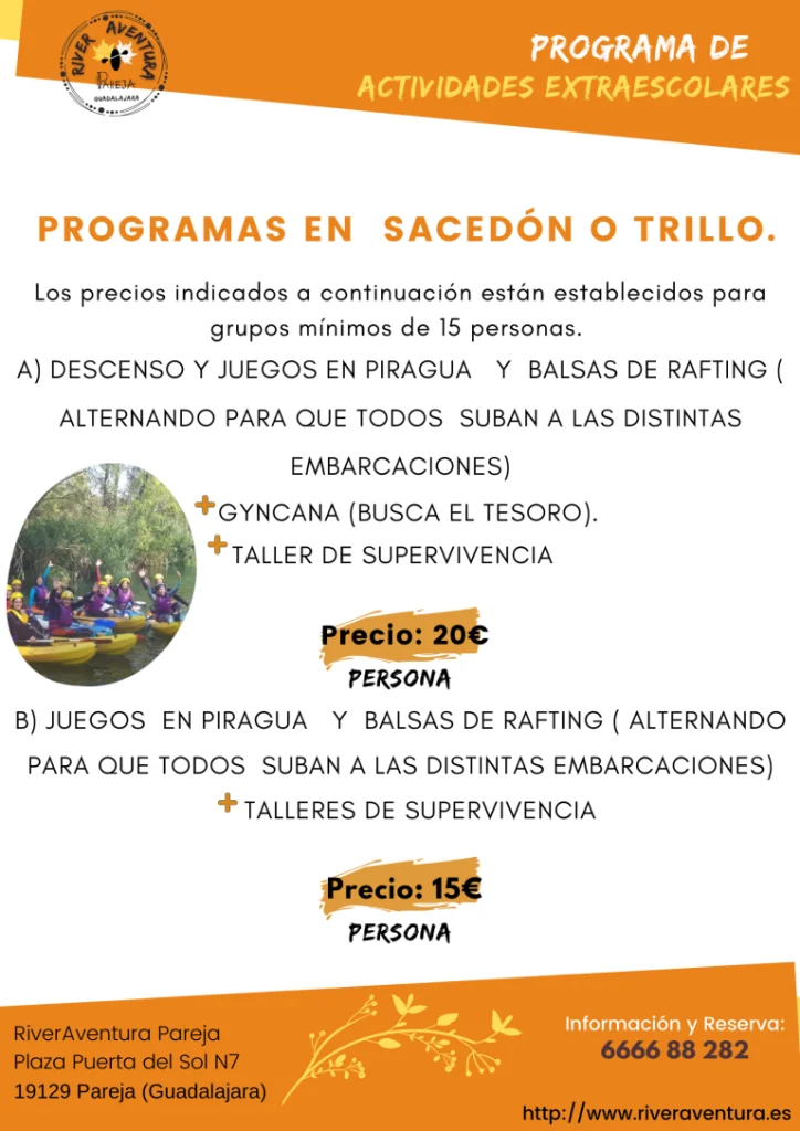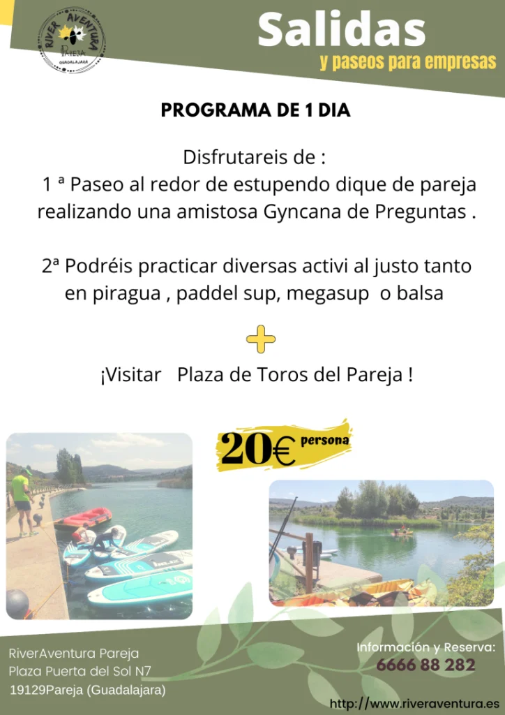 Nuestra sede se encuentra en el pueblo de Pareja, en la provincia de Guadalajara. Nos especializamos en actividades en el Embalse de Entrepeñas, el dique de Pareja y los ríos Tajo y Guadiela para actividades de aguas bravas. También estamos expandiendo nuestras zonas de operación para brindar los mejores servicios.
